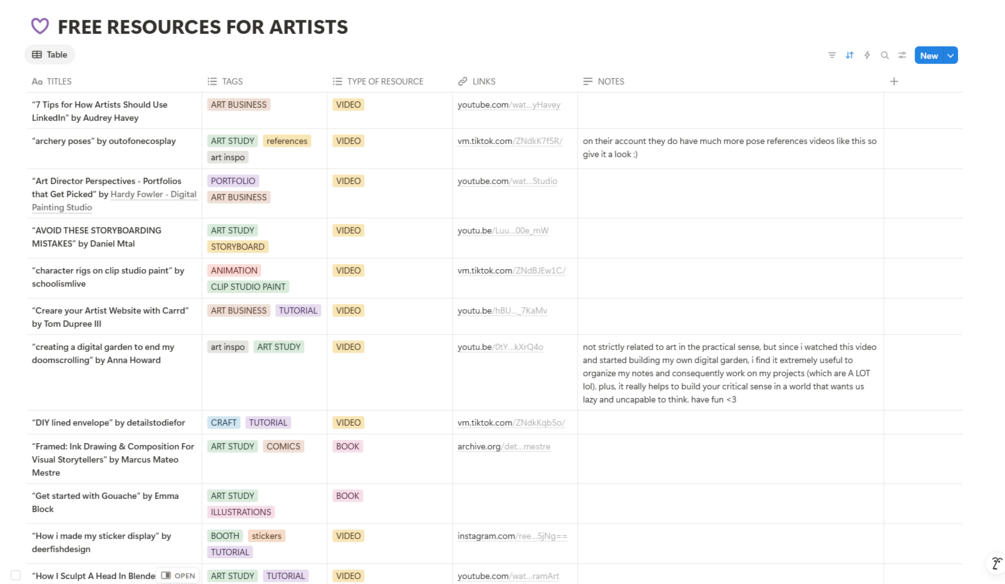 A constantly updated Notion table which contains several resources for artists, labeled by category, type and URLs. All free and available online.